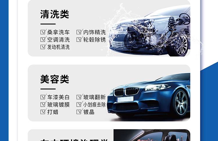 服務包括清洗類(桑拿洗車、內飾精洗、空調清洗、輪轂除銹、發(fā)動機清洗)、美容類(車漆美白、玻璃翻新、玻璃鍍膜、小劃痕去除、打蠟、鍍晶)、車內環(huán)境治理類(內飾香薰、新車除醛、負離子車內凈化)、搶險救援類(車胎補氣、輪胎更換、補胎)等。